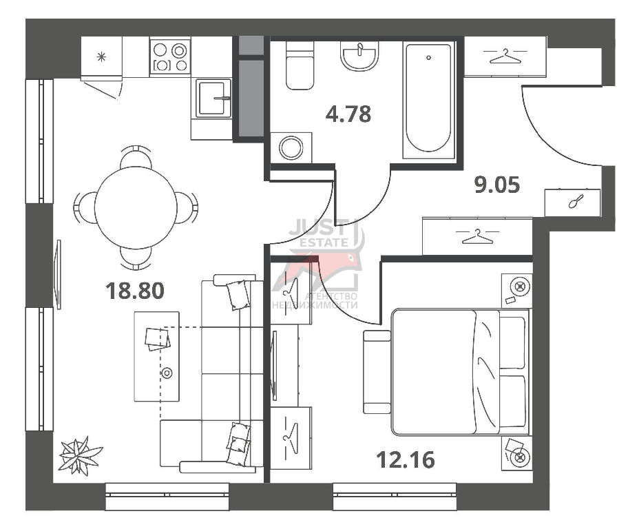 Большая кухня-гостиная, уютная спальня и компактный санузел дополнены местами для хранения, мебелью и бытовой техникой.